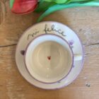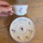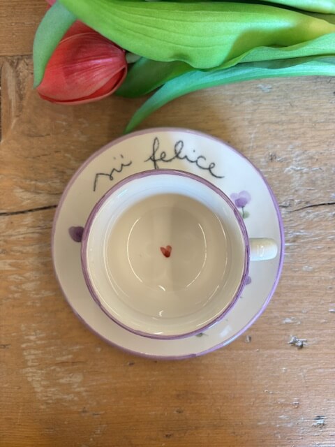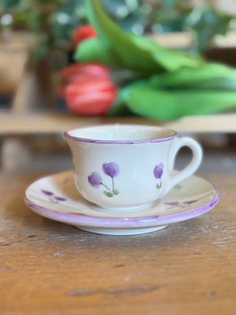 Tazzina con piattino in ceramica dipinte a mano da noi. Sono tutti pezzi unici ed è per questo che potranno differire dalle foto . Le piccole imperfezioni sono parte dell’artigianalità e dell’unicità di ogni prodotto. Se il prodotto è esaurito contattateci per verificarne la disponibilità in negozio.