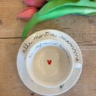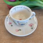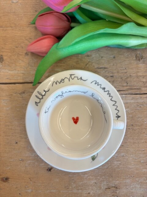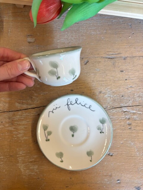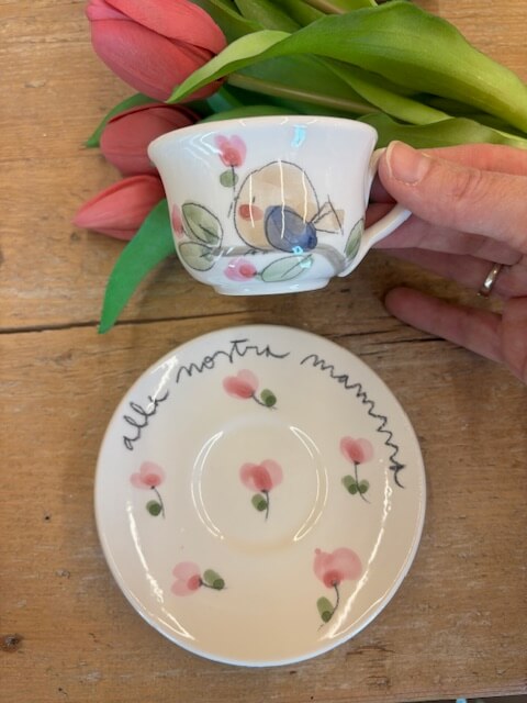 Tazzina con piattino in ceramica dipinte a mano da noi. Sono tutti pezzi unici ed è per questo che potranno differire dalle foto . Le piccole imperfezioni sono parte dell’artigianalità e dell’unicità di ogni prodotto. Se il prodotto è esaurito contattateci per verificarne la disponibilità in negozio.