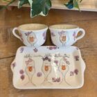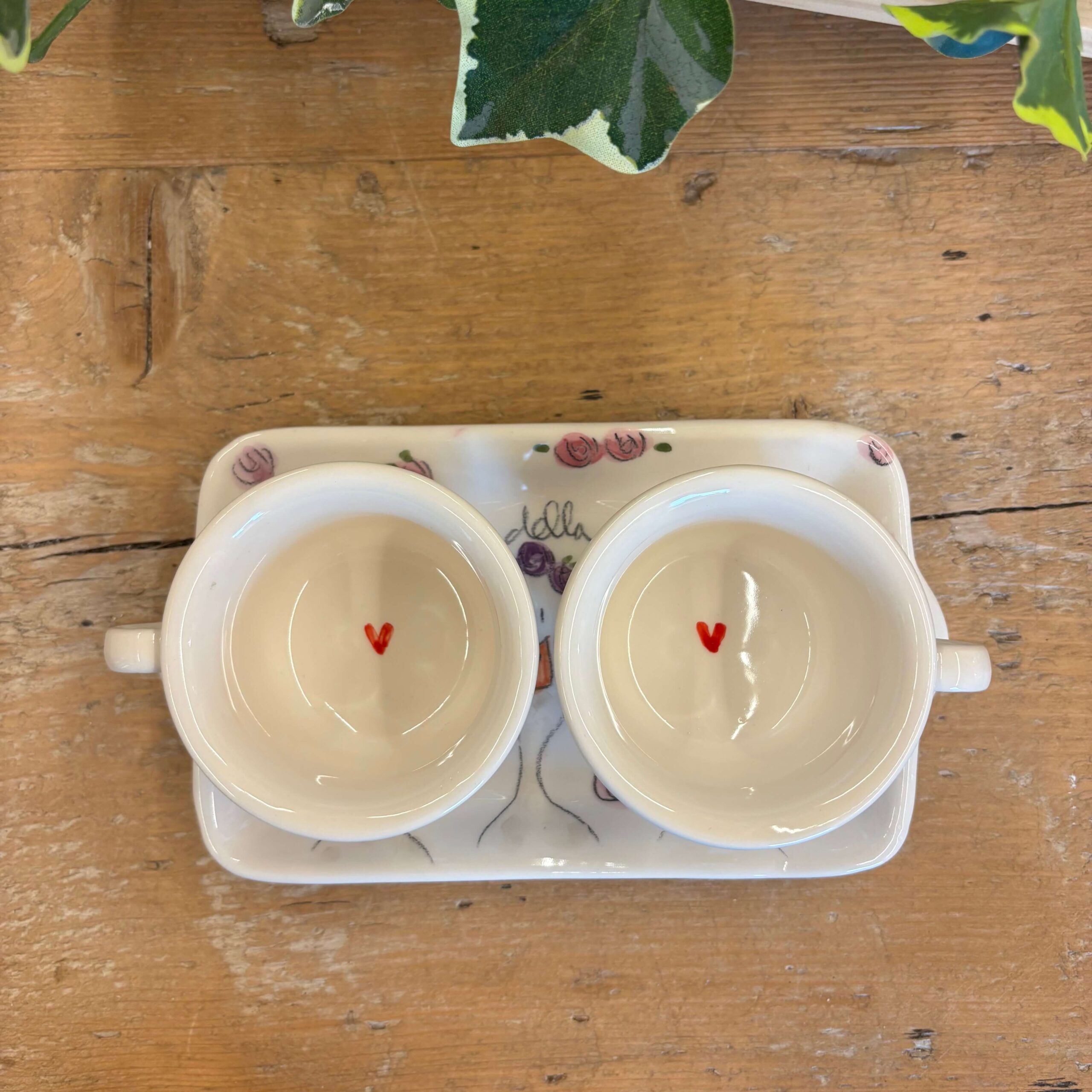Servizio da caffè per due con vassoietto e due tazzine in ceramica dipinto a mano da noi. Sono tutti pezzi unici ed è per questo che potranno differire dalle foto . Le piccole imperfezioni sono parte dell’artigianalità e dell’unicità di ogni prodotto. Se il prodotto è esaurito contattateci per verificarne la disponibilità in negozio.