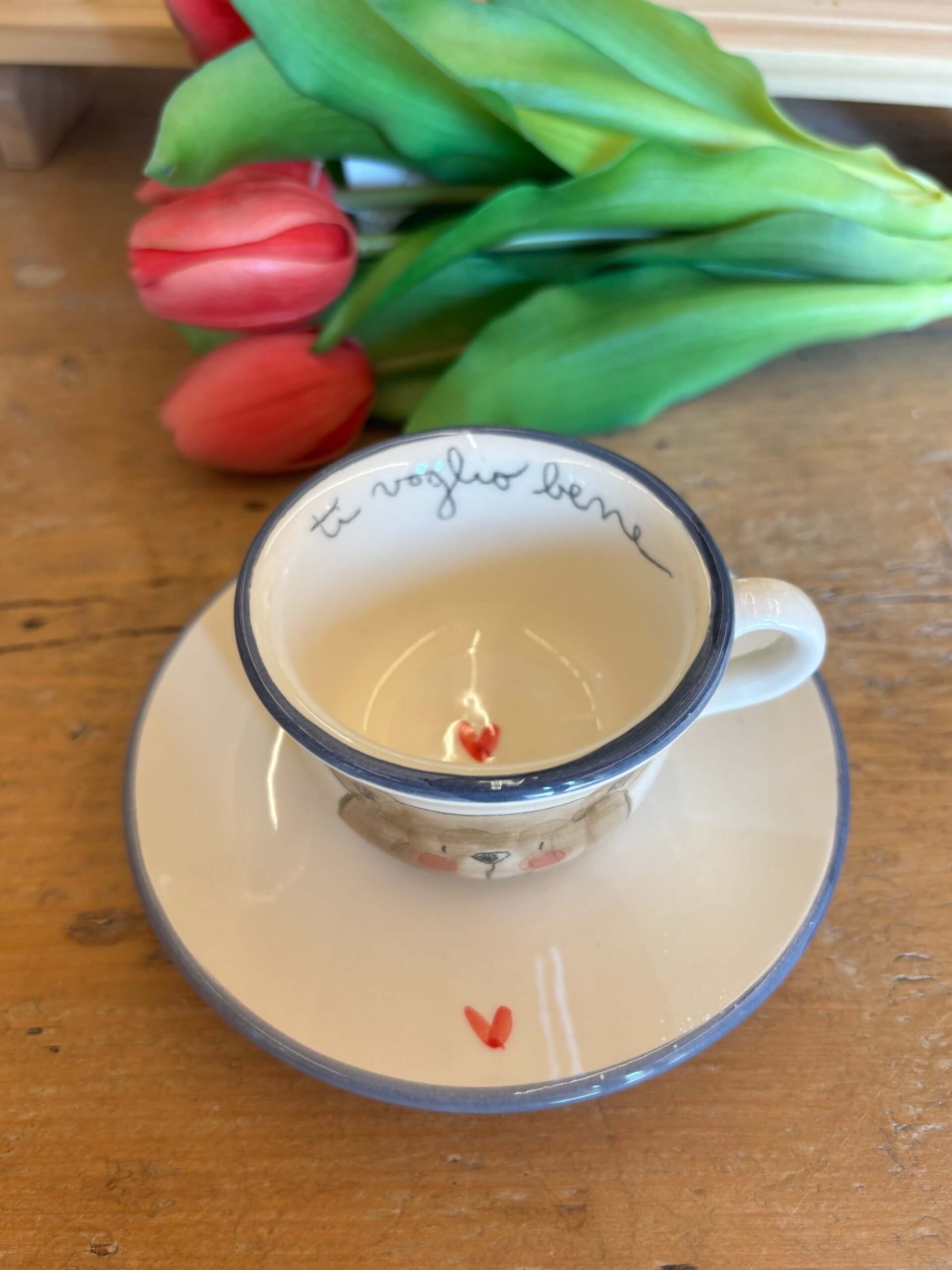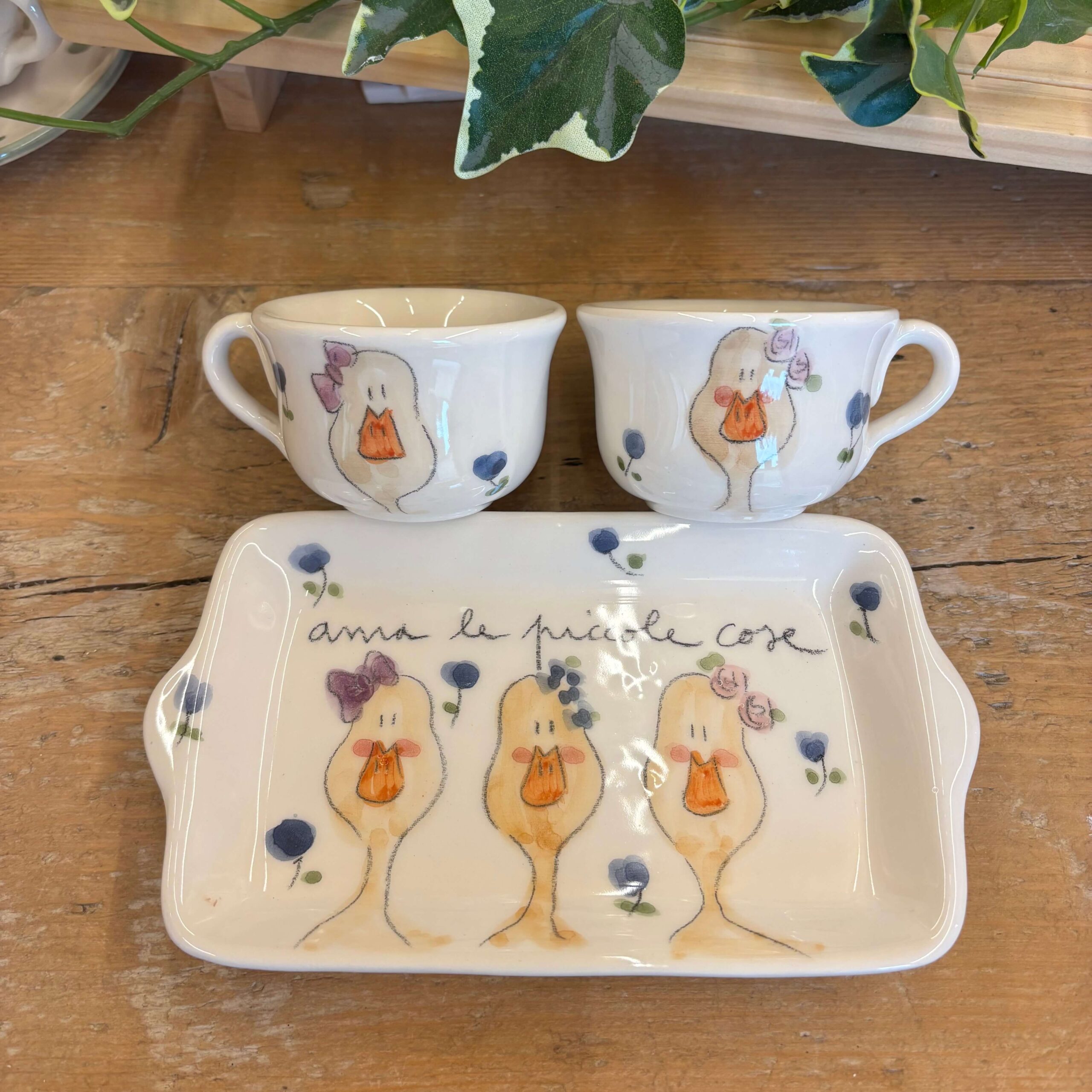 Servizio da caffè per due con vassoietto e due tazzine in ceramica dipinto a mano da noi. Sono tutti pezzi unici ed è per questo che potranno differire dalle foto . Le piccole imperfezioni sono parte dell’artigianalità e dell’unicità di ogni prodotto. Se il prodotto è esaurito contattateci per verificarne la disponibilità in negozio.